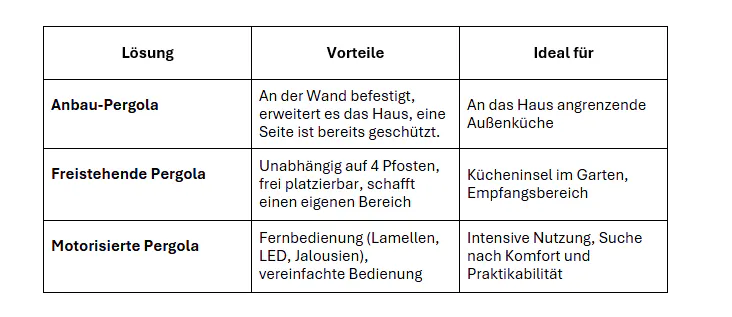 Nach Ihrem Klima: Regionen mit häufigem Regen oder starkem Wind erfordern eine bioklimatische Pergola zum Schutz Ihrer Küche vor Witterung. In sonnigen oder gemäßigten Zonen eignen sich je nach Budget alle Überdachungstypen.