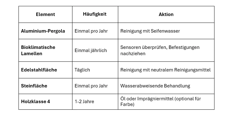Eine jährliche Reinigung mit Seifenwasser genügt. Bei motorisierten Modellen prüfen Sie die Funktion der verstellbaren Lamellen und testen Sie bei Ausstattung die Regensensoren. Ziehen Sie bei Bedarf Befestigungen nach.