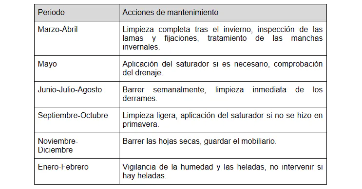 Inspecciona tu terraza después de cada invierno para detectar lamas dañadas o fijaciones sueltas. Un mantenimiento preventivo regular cuesta menos que sustituir secciones enteras de la terraza.