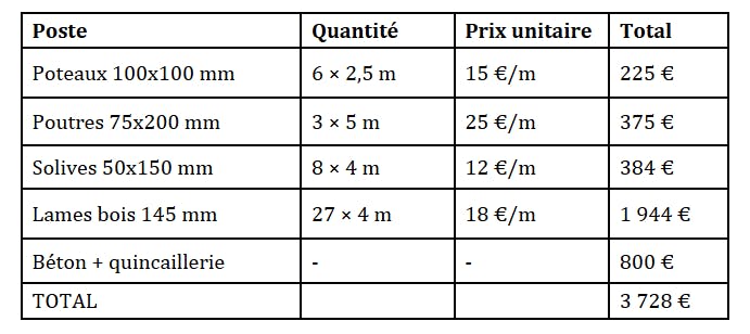 Comptez entre 3 300 € (bois traité, auto-construction) et 8 000 € (composite Perenza avec pose professionnelle). Le budget varie selon les matériaux (bois ou composite), la complexité du terrain et le recours ou non à un artisan.