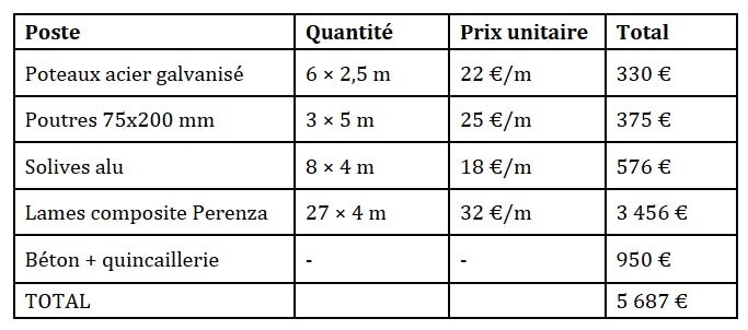- Composite Perenza : 55 €/m² × 20 m² = 1 100 € + 0 € entretien = 1 100 €