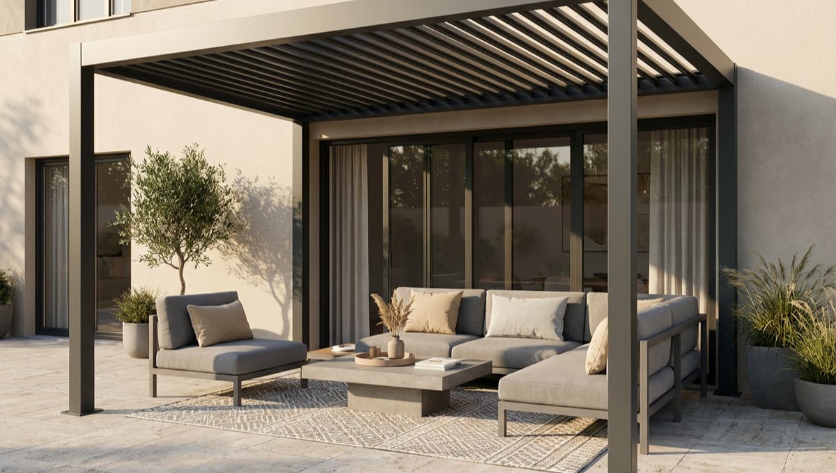 Le style moderne repose sur des lignes géométriques et une palette neutre : gris anthracite, blanc, noir ou taupe. Sous une pergola en aluminium comme celles proposées par PERENZA, cette approche crée une continuité visuelle naturelle avec la structure.
