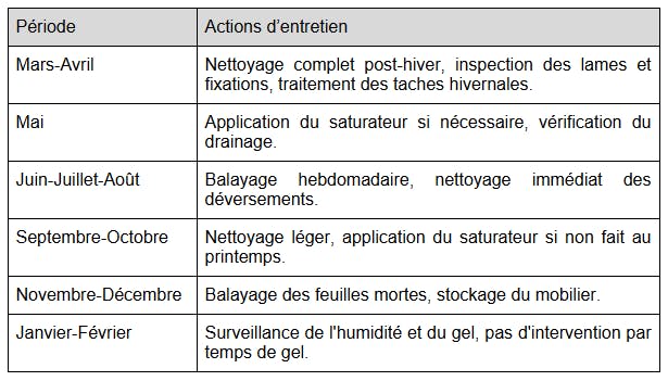 Inspectez votre terrasse après chaque hiver pour repérer les lames endommagées ou les fixations desserrées. Un entretien préventif régulier coûte moins cher que le remplacement de sections entières de terrasse.