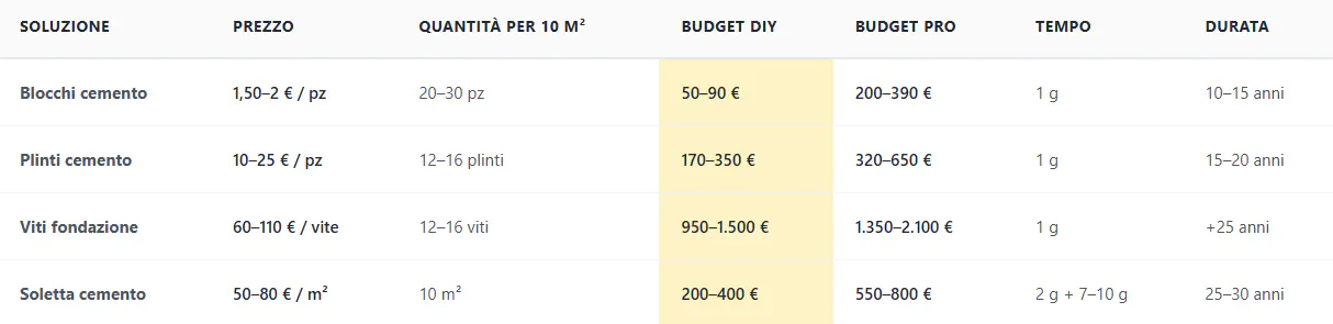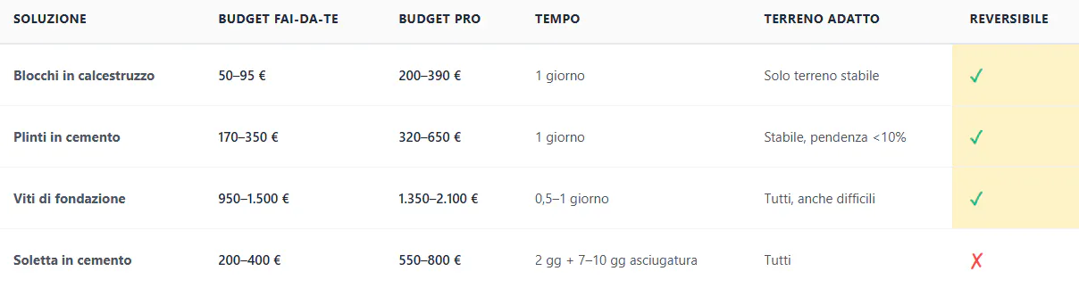 Le alternative economiche (blocchetti, supporti) permettono di ridurre il costo da 2 a 10 volte rispetto a una platea in cemento. Le viti di fondazione, sebbene più costose di una platea, restano l'unica opzione praticabile su terreni difficili.