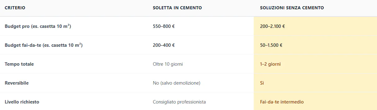 La platea in cemento rappresenta un investimento di 550-800 € con un professionista per una casetta standard di 10 m², a cui si aggiungono da 7 a 10 giorni di attesa obbligatoria prima dell'installazione. Di seguito un confronto tra la platea in cemento e le altre alternative.