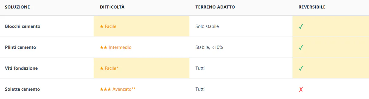 Esistono 3 alternative senza cemento: blocchetti in cemento e supporti per dimezzare o ridurre di 4 volte il budget su un terreno stabile, oppure le viti di fondazione per i terreni difficili, l'unica soluzione praticabile senza cemento su terreni cedevoli o in pendenza.